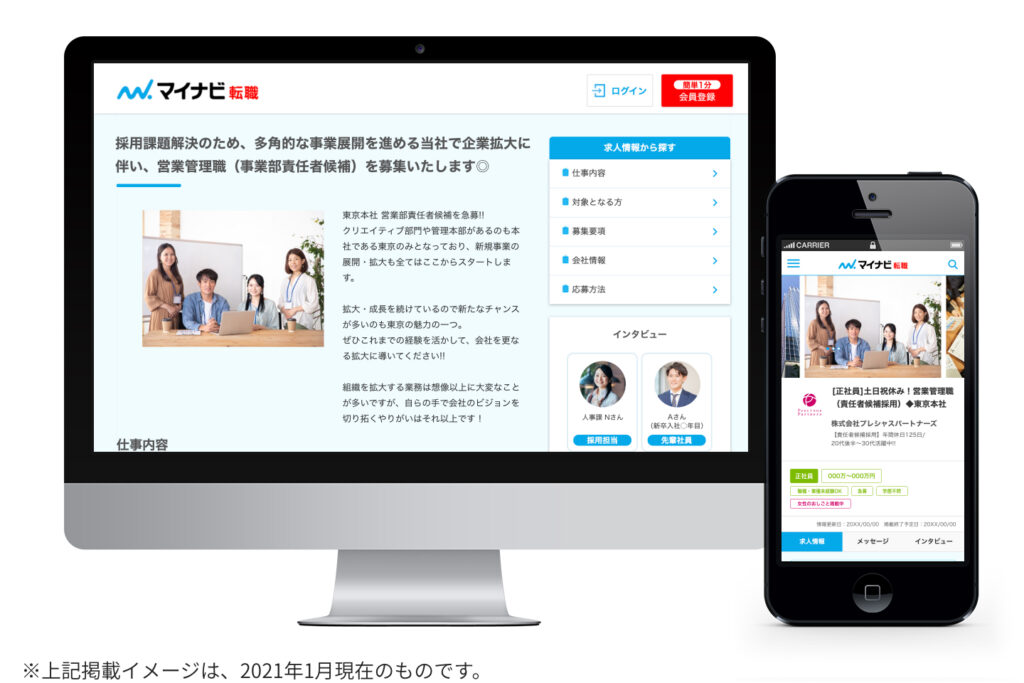 「マイナビ転職」は2019年7月、従来よりも企業理解を深め、応募意欲を高める求人原稿にすることを目的に、サイトリニューアルが行われました。入社後のイメージが伝わりやすいテンプレートの導入や、実際に働いている社員のインタビュー項目欄を強化することで、リアルな職場の雰囲気を伝えることが可能に。併せてスマートフォンでの表示に最適化した求人デザイン・構成になったことで、ユーザーがさらに使いやすい仕様に進化を遂げています。