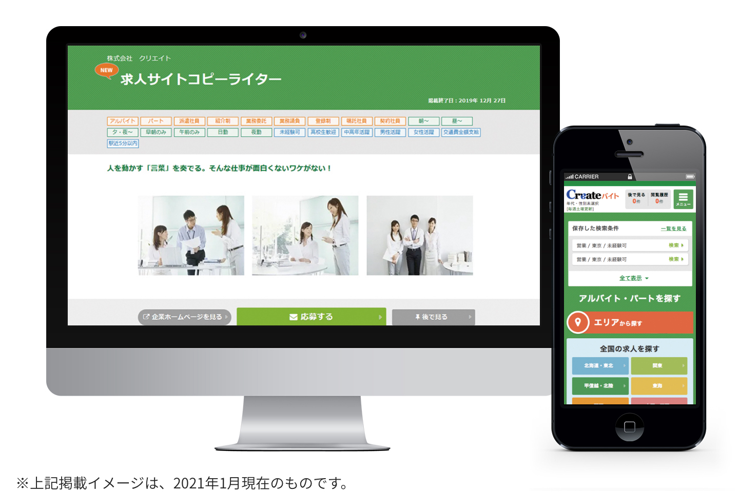 多様化する仕事探しのスタイルにあわせて、「クリエイトバイト」はPC、スマートフォンに完全対応しています。また、求職者の気になるポイントが一目で伝わるよう、アイコンも見やすさ・伝わりやすさを重視したシンプルなデザインになっています。スマートフォンからアクセスされる求職者向けに、画像1点入りの同一表示で、検索結果画面は、どのプランも同様の形式で掲載されます。