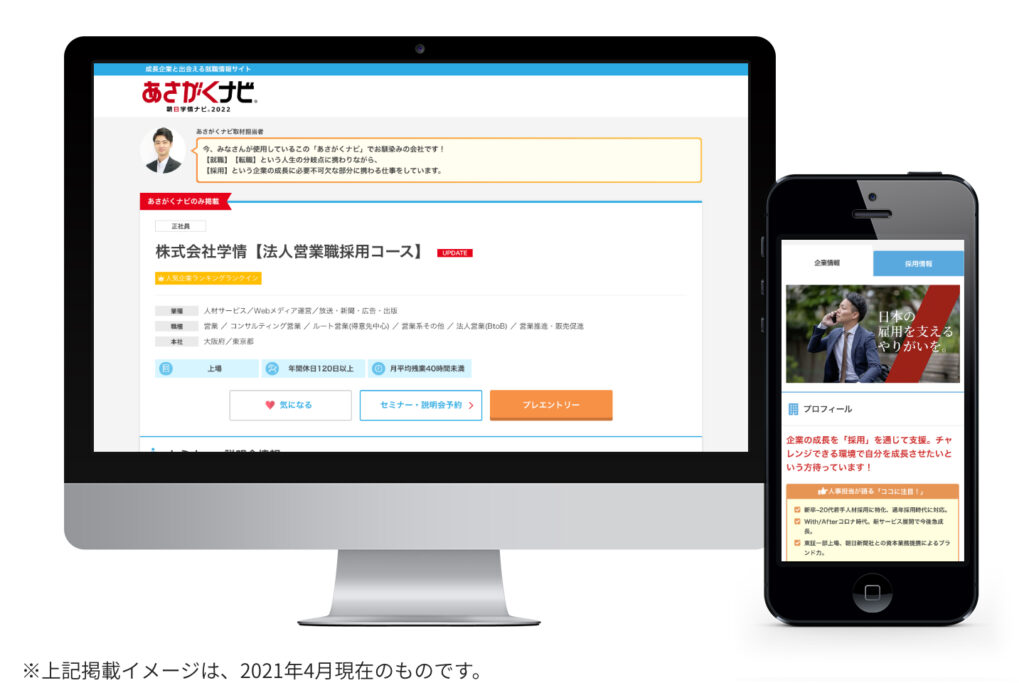 「あさがくナビ(グランドサイト)」は、「企業情報」「採用情報」の2つのタブに分かれており、掲載情報がわかりやすい設計になっています。