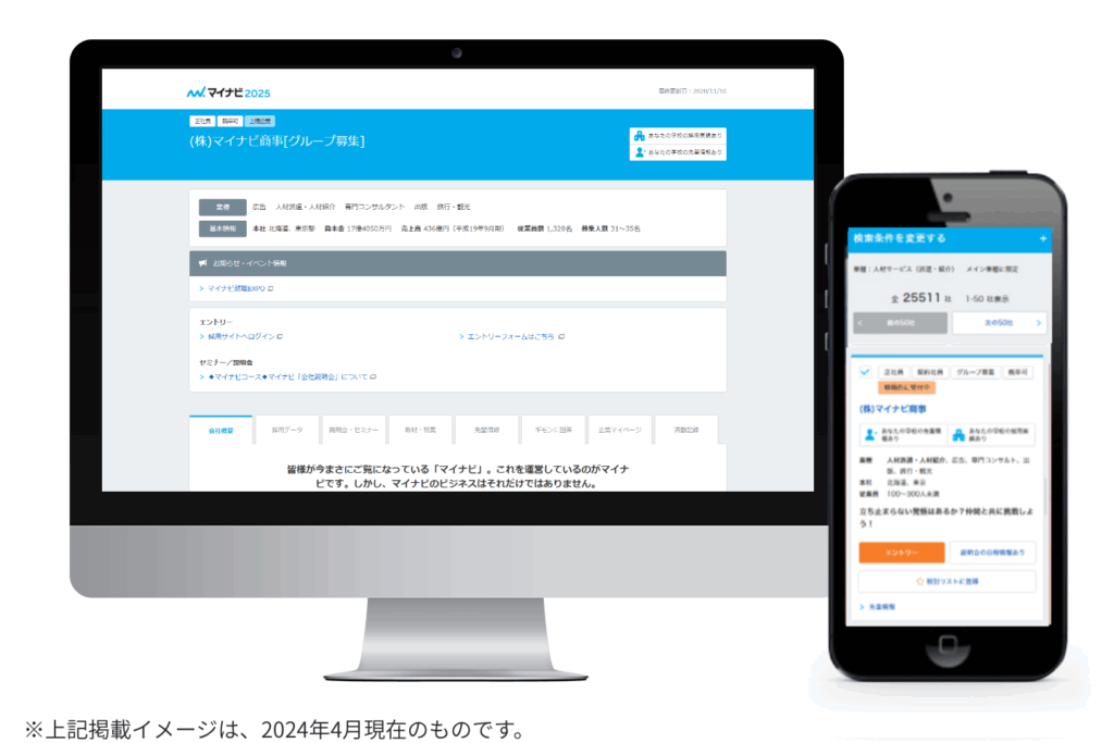 「マイナビ2025」は株式会社マイナビが運営する新卒採用の総合サービスです。ナビ企画「マイナビ2025本サイト」を軸に、イベント企画「マイナビ就職エキスポ」やWebセミナー「マイナビTV」の配信など、総合的に新卒採用の企画を展開。有名漫画キャラクターを起用したプロモーションや、Web面談機能の導入など、知名度アップとユーザビリティーの向上を両立し、「もっとも利用された就職サイトNo.1(※)」に輝いています。