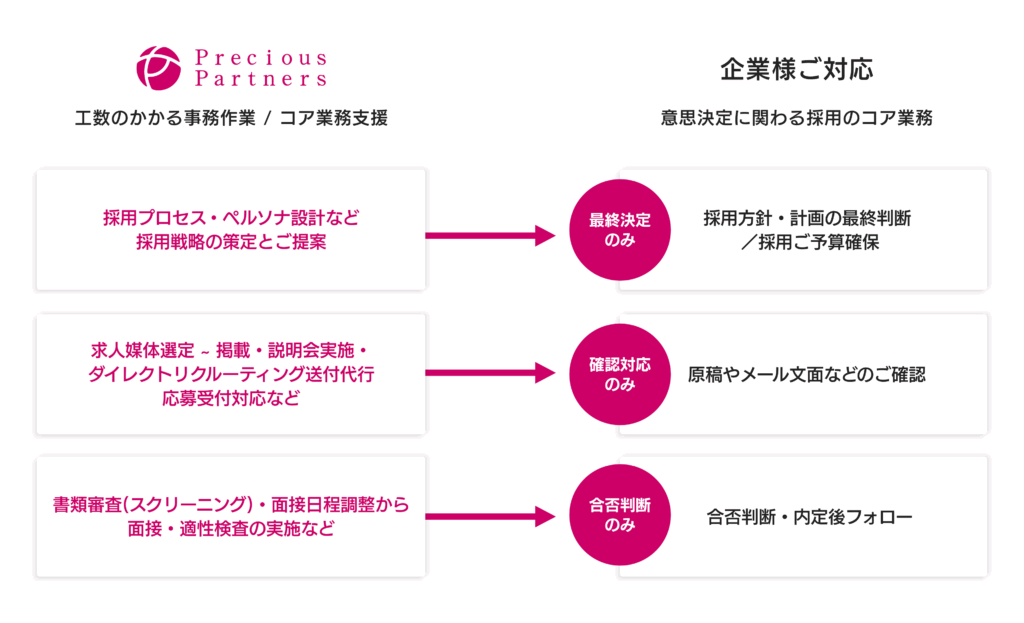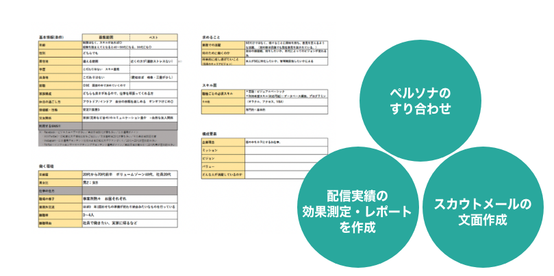 「ダイレクトリクルーティング」や「スカウトサービス」などのスカウト業務を代行するサービスです。送付条件や求める人物像のすり合わせを行い、最も効果的なメール文面を作成。メール配信後は、返信率、面談日設定率の分析を行うことで配信実績の効果測定・レポートを作成・提出するため、ノウハウの蓄積も可能です。