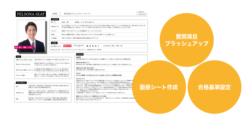 定着・活躍を見据えたペルソナ設計を行います。また、面接項目が設計したペルソナに沿っているかを確認し、質問項目や面接フロー、合格基準の設定までサポートを行います。