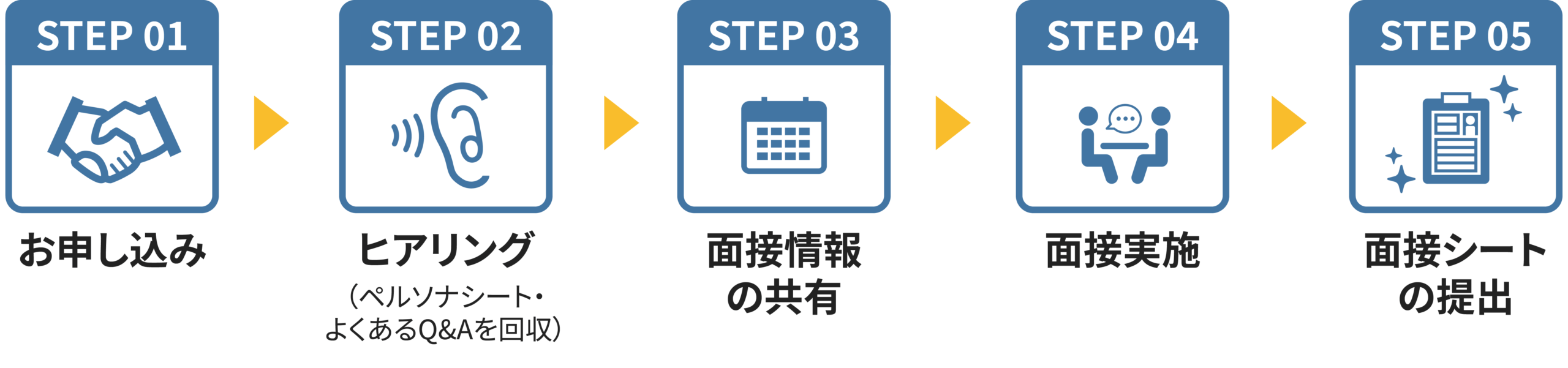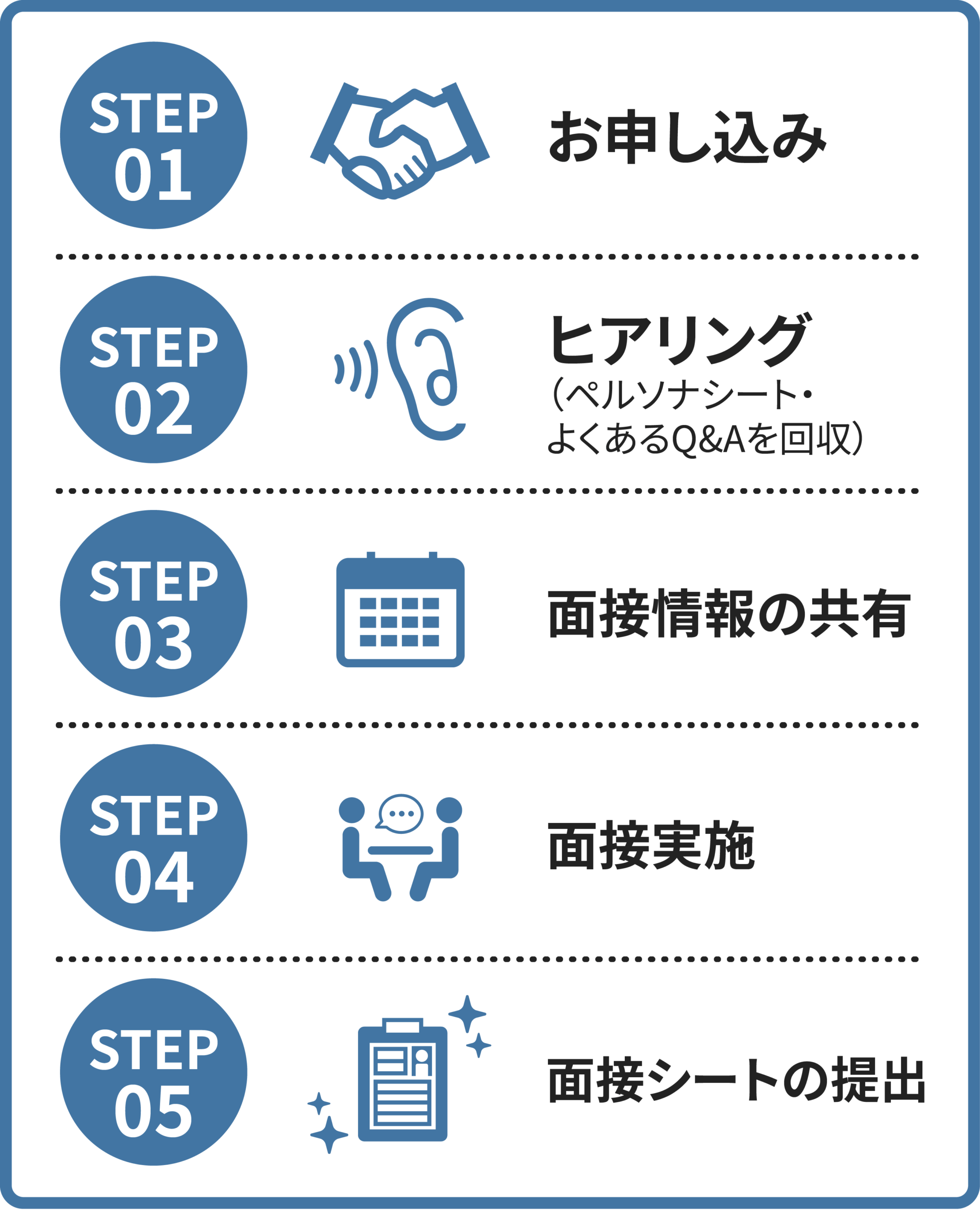「仕事を行ううえで必要なスキルや能力があるか」「自社とマッチングする人物像であるか」を、面接を通してチェックいたします。ペルソナシートやホームページ、企業紹介動画、説明会資料、よくあるQ&Aなど、企業様の情報を事前に調べたうえで面接に臨むため、自社の魅力をアピールしきれないリスクやミスマッチなどのご心配も不要です。