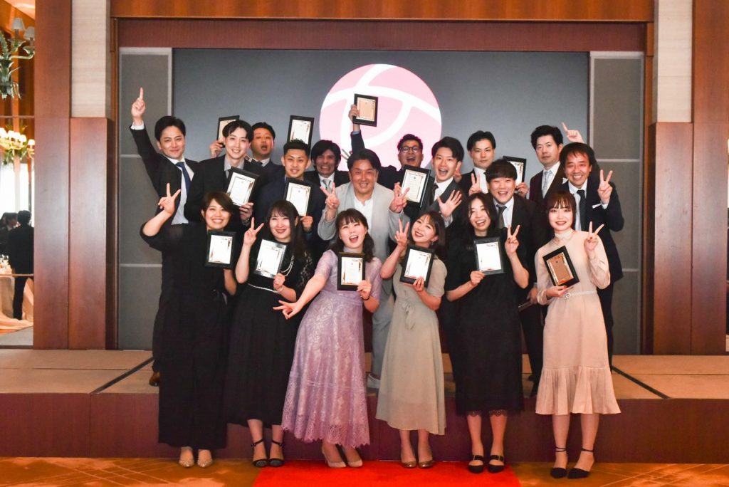 社員の一年間の成果を称えるものとして、社内表彰式を開催。営業に限らず、すべての社員に表彰されるチャンスがあり、「新人賞」「MVP賞」など各部門に選ばれるのはただ一人👀