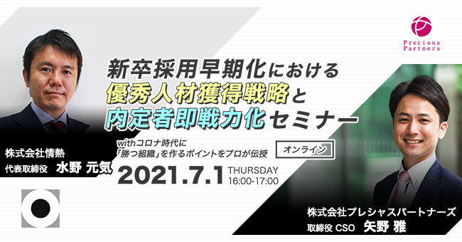 7月1日(木)に弊社矢野が株式会社情熱・代表取締役社長水野元気様との共催セミナー、「新卒採用「超」早期化における優秀人材獲得戦略と内定者即戦...