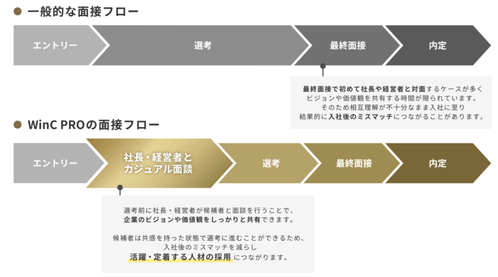 WinC PROでは面接の最初の段階で、社長・経営者と対話を行うことを必ず行っています。一次・二次面接を通じて理解が深まり、結果的に“企業への共感”が強くなります。