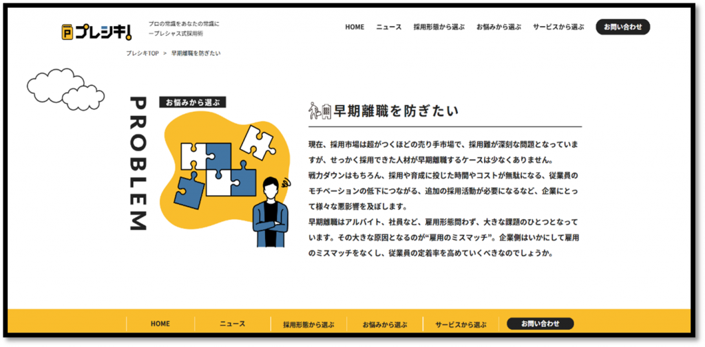 「早期離職を減らしたい」「採用マッチングを強化したい」など、採用に関するよくあるお悩みから課題解決のためのサービスをご紹介。原因と対策を分かりやすく解説した記事が掲載されており、どのようなサービスが効果的か一目で分かります◎