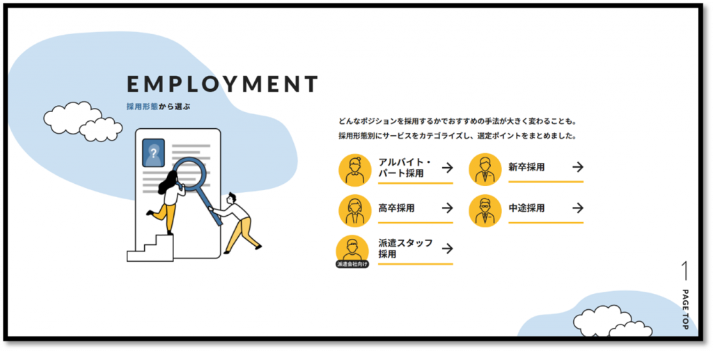 「アルバイト・パート採用」「新卒採用」など採用形態からどのようなアプローチ方法があるのかを知ることができます✨