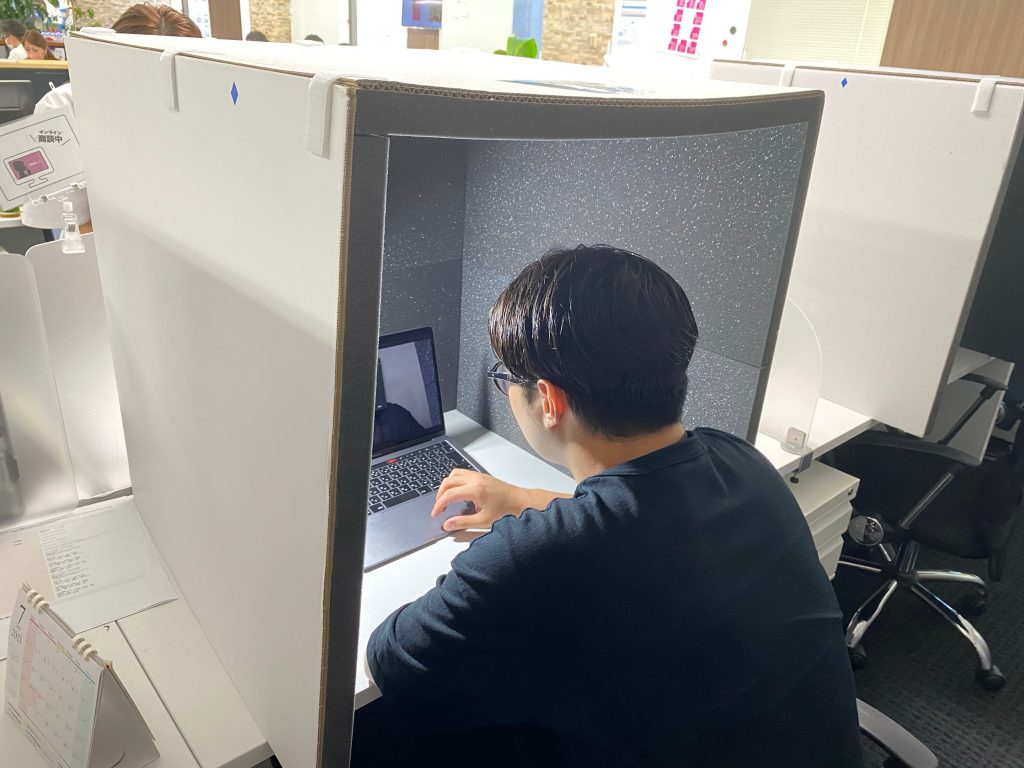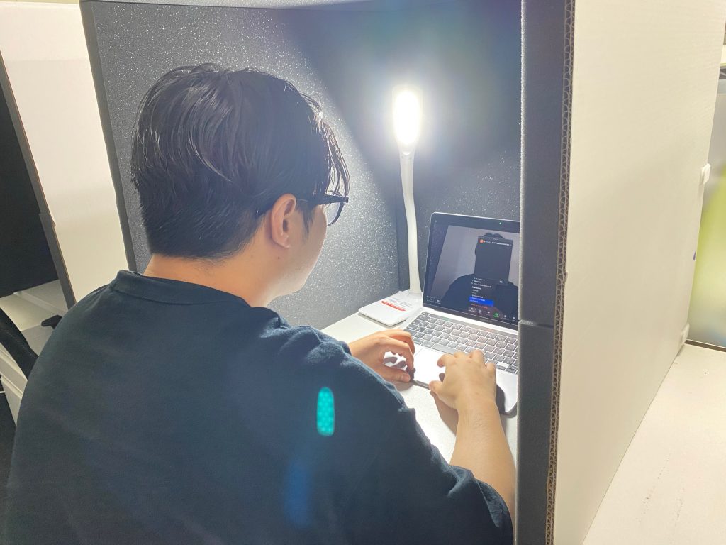このブースを使用することによって、オンライン商談時の騒音をカット。また、視覚的情報のシャットアウトや飛沫防止などのメリットも🙆♀️