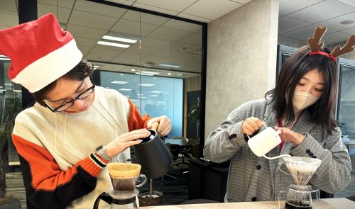 「朝活」として、朝早めに出社しこだわりのコーヒーを楽しみながら、メンバー同士の新たな交流をはかりました🎄