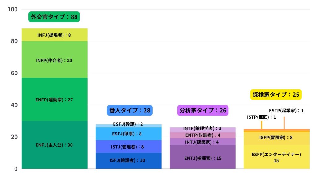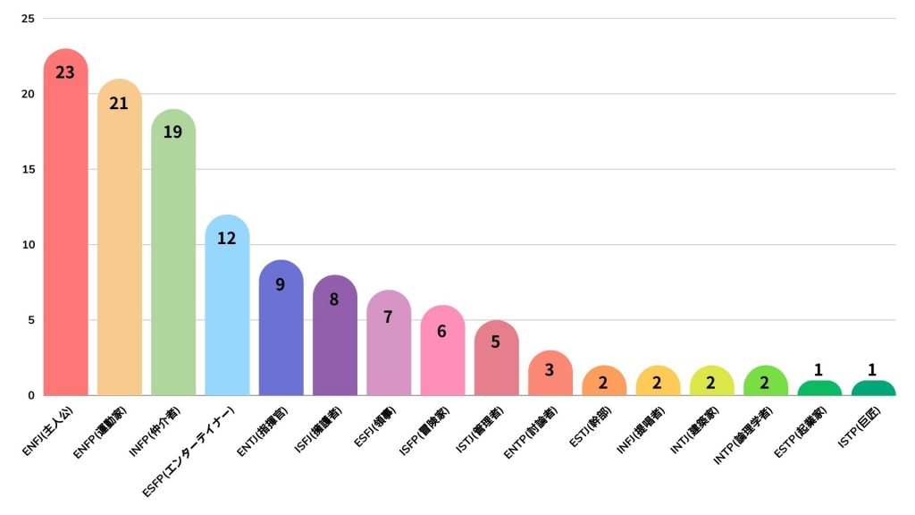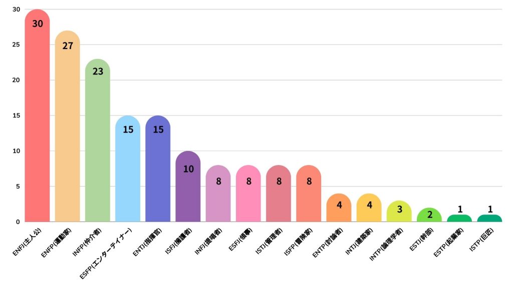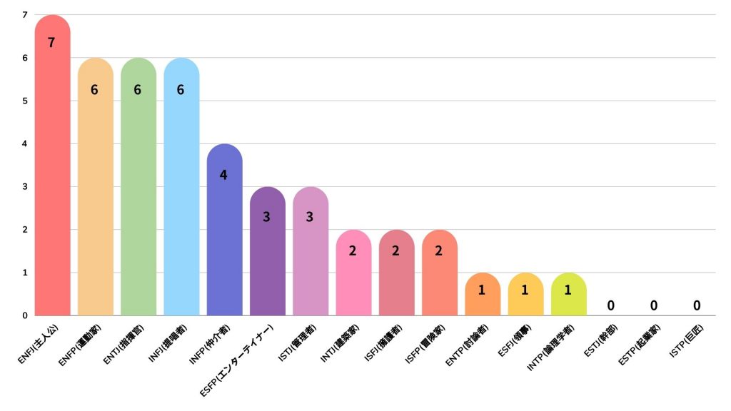 MBTI分析の結果からわかることは、「ENFJ(主人公)」と「ENFP(運動家)」が特に多いことから、全体的に社交的で直感的、感受性が高いメンバーが多いと考えられます。