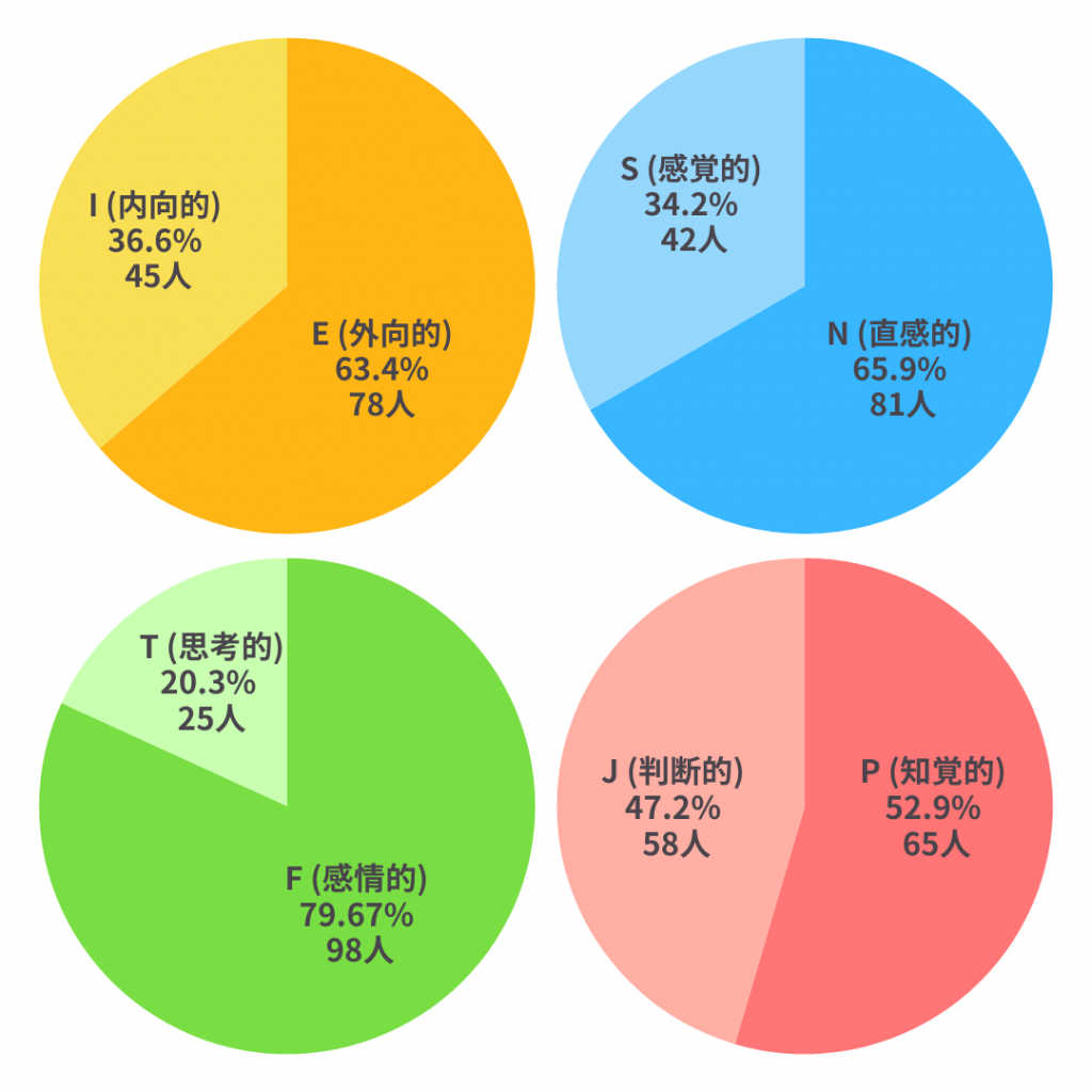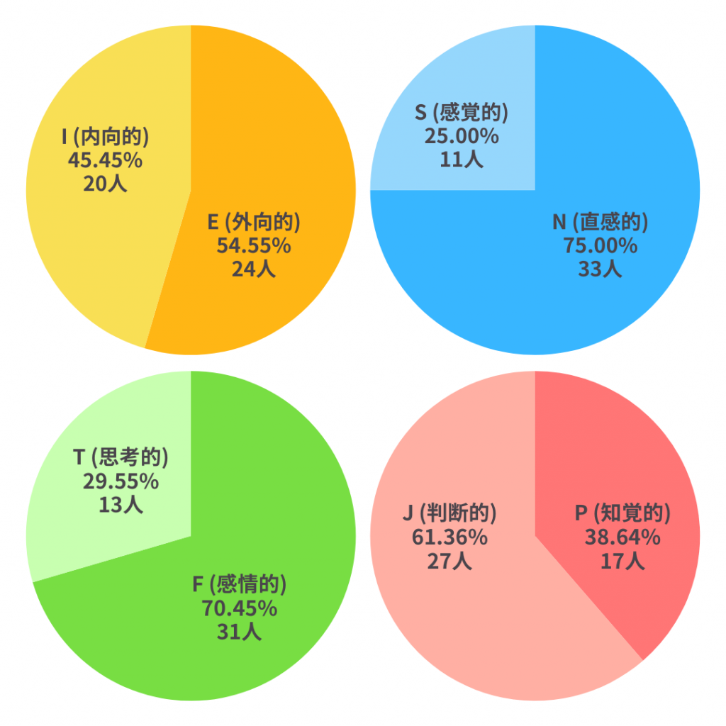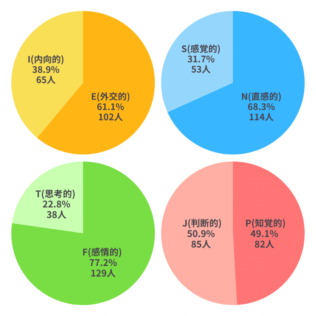 また、「J(判断型)」が多く、計画的に物事を進め、明確なスケジュールや目標を設定し、効率的に行動する人が多い傾向です。