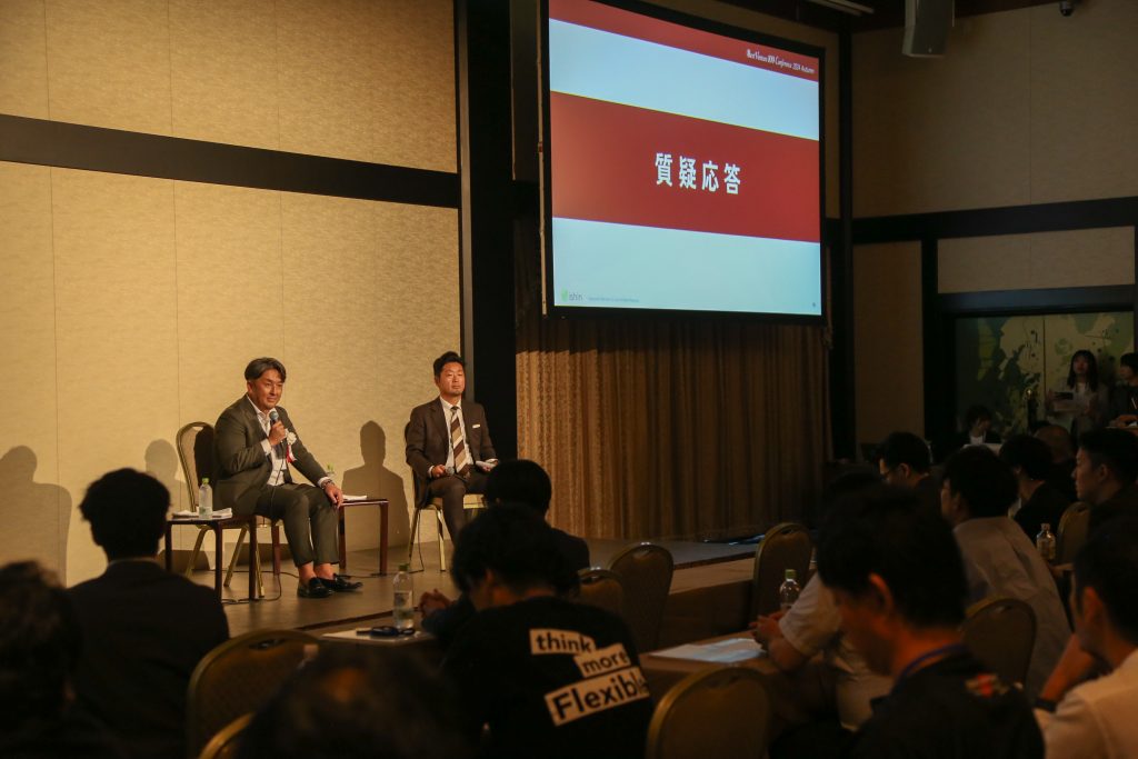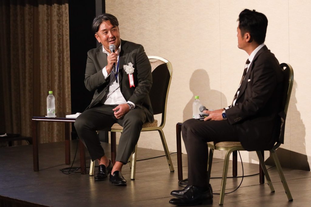 カンファレンスを主催するイシン株式会社の片岡様とともに、「昆虫型経営と恐竜型経営 “100人の壁突破の要諦”」をテーマにお話ししました。