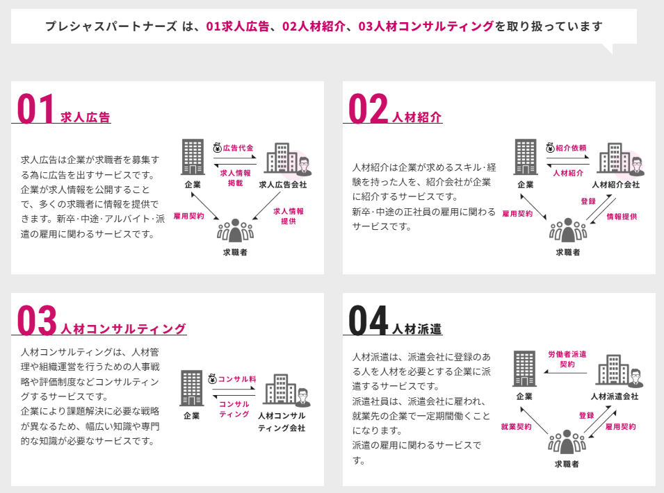 人材業界は、大きく分けると4つに分かれており、それぞれ支援する対象や内容が大きく異なります。プレシャスパートナーズでは、求人広告、人材紹介、人材コンサルティングの事業を展開しています。