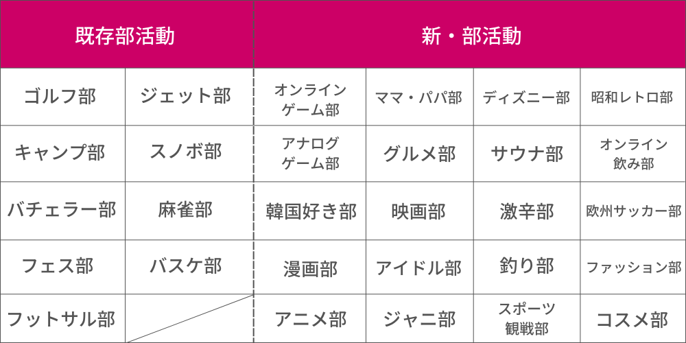 オンラインゲーム部/アナログゲーム部/韓国好き部/アニメ部/ママパパ部/グルメ部/映画部/アイドル部/ジャニ部/ディズニー部/サウナ部/激辛部/釣り部/スポーツ観戦部/昭和レトロ部/オンライン飲み部/欧州サッカー部/ファッション部/コスメ部