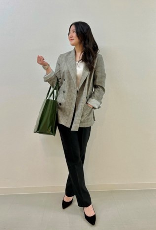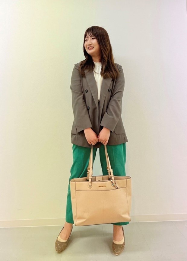 グリーンのバックが差し色になっていて、大人カジュアルな着こなしですね💙