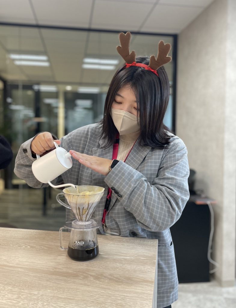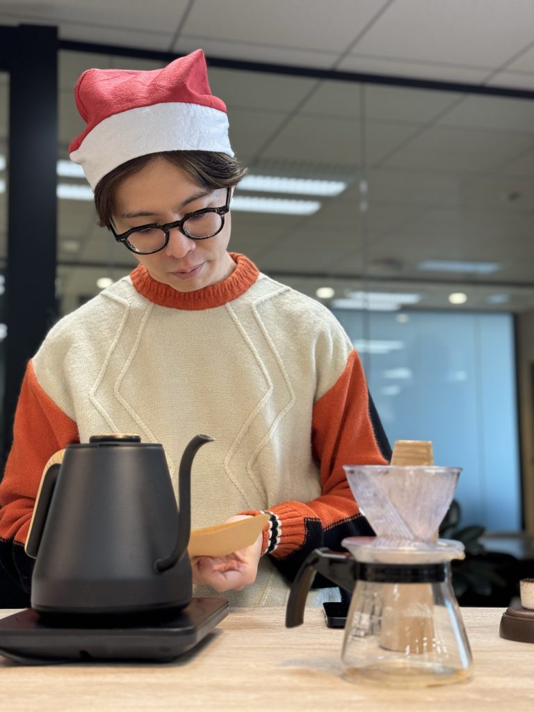 師走の朝をホッと一息つけて1日の良いスタートを切れるような朝活企画として、サンタとトナカイに扮したバリスタ(コーヒー好きのメンバー)がこだわりのコーヒーを淹れて振る舞いました!