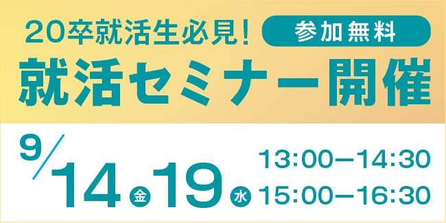 2018年9月14日(金)、19日(水)に20卒就活生向けスペシャルセミナー「失敗しない就活対策セミナー」を開催いたします。