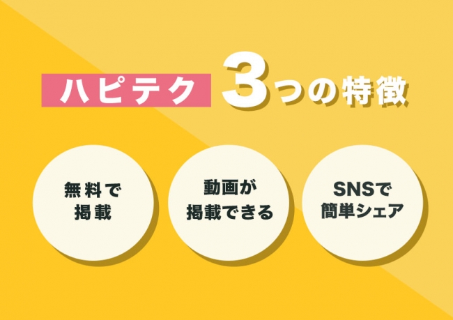 ハピテクは、テイクアウト情報を無料で掲載することができます。店舗情報・テイクアウトメニューなどの情報を掲載し、SNSで簡単にシェアができるため、告知・宣伝に活用していただけます。また動画を掲載することもでき、動画を通じてお店の想いをより伝えることができます。
