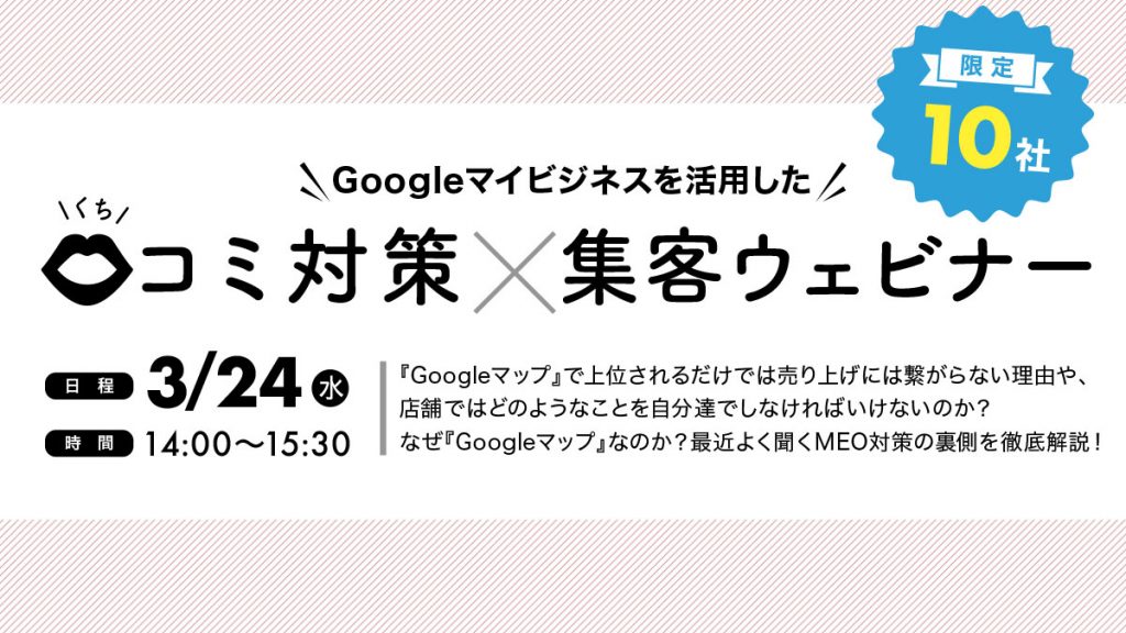 3月24日(水)14時~15時30分にGoogleマイビジネスを活用した「口コミ対策、集客ウェビナー」を開催いたします。