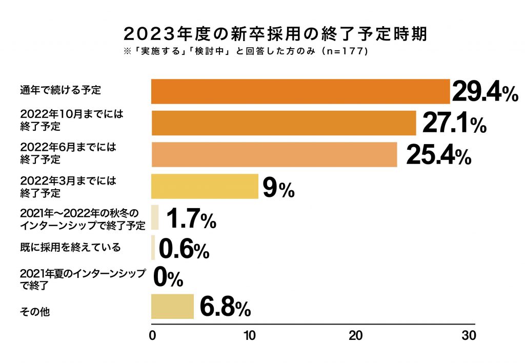 2023年度の新卒採用を「実施する」「検討中」と回答した企業を対象に、新卒採用の終了予定時期を尋ねたところ、「通年で続ける予定」(29.4%)が最多となりました。一方で「既に採用活動を終えている」(0.6%)、「2021年~2022年の秋冬のインターンシップで終了予定」(1.7%)、「2022年3月までには終了予定」(9%)、「2022年6月までには終了予定」(25.4%)、「2022年10月までには終了予定」(27.1%)を合算すると63.8%が2022年中に終了予定という結果になりました。