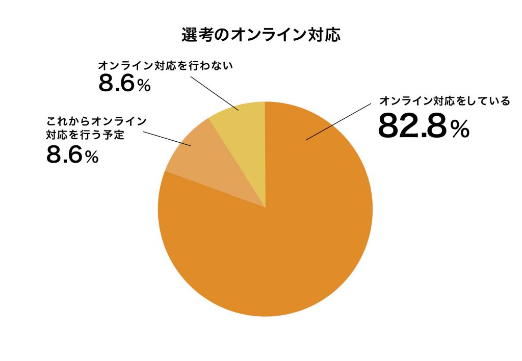 2022年度の新卒採用において選考のオンライン対応の状況を尋ねたところ、82.8%が「オンライン対応をしている」と回答いたしました。「これからオンライン対応を行う予定」(8.6%)の回答を合算すると91.4%がオンライン対応を行うという結果になっています。
