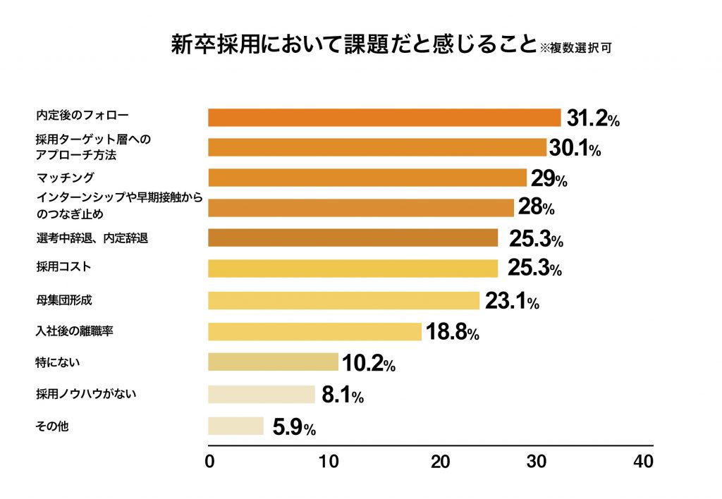 新卒採用において課題だと感じることを尋ねたところ、「内定後フォロー」(31.2%)が最多となりました。次いで「採用ターゲット層へのアプローチ方法」(30.1%)、「マッチング」(29%)という結果になっております。採用期間が早期化・長期化することで選考中や内定後のフォローに課題を感じているのが多いと言えそうです。