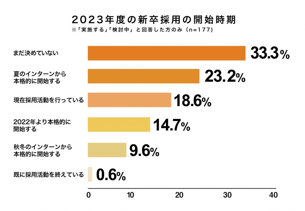 2023年度の新卒採用を「実施する」「検討中」と回答した企業を対象に、新卒採用の開始時期について尋ねたところ、「まだ決めていない」(33.3%)が最多でした。一方で「既に採用活動を終えている」(0.6%)、「現在採用活動を行っている」(18.6%)を合算すると19.2%が既に採用活動を開始しており、さらに「夏のインターンから本格的に開始する」(23.2%)、「秋冬のインターンから本格的に開始する」(9.6%)を合算すると52%が年内に採用活動を開始する予定です。