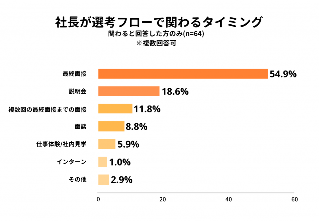また、62.7%の企業が新卒採用選考フローに社長が関わると回答しました。その中でも社長が関わるタイミングは最終面接(54.9%)が最多となり、企業のトップである社長と、今後共に働いていく学生が、最終的に実際に会うことで双方の相性を図ることを重要視している企業が多いと考えられます。