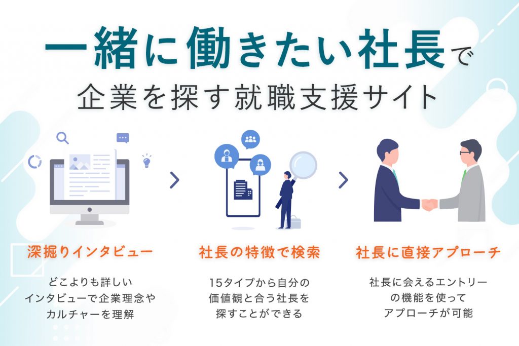一緒に働きたい”社長”で企業を探すことができる就職支援サイトです。社長・経営者の想いや企業理念、ビジョンから、ぴったりの企業を見つけることができます。「社長の特徴」から企業を検索することができ、「社長に会えるエントリー」を通じて、社長・経営者とのマッチングを実現。