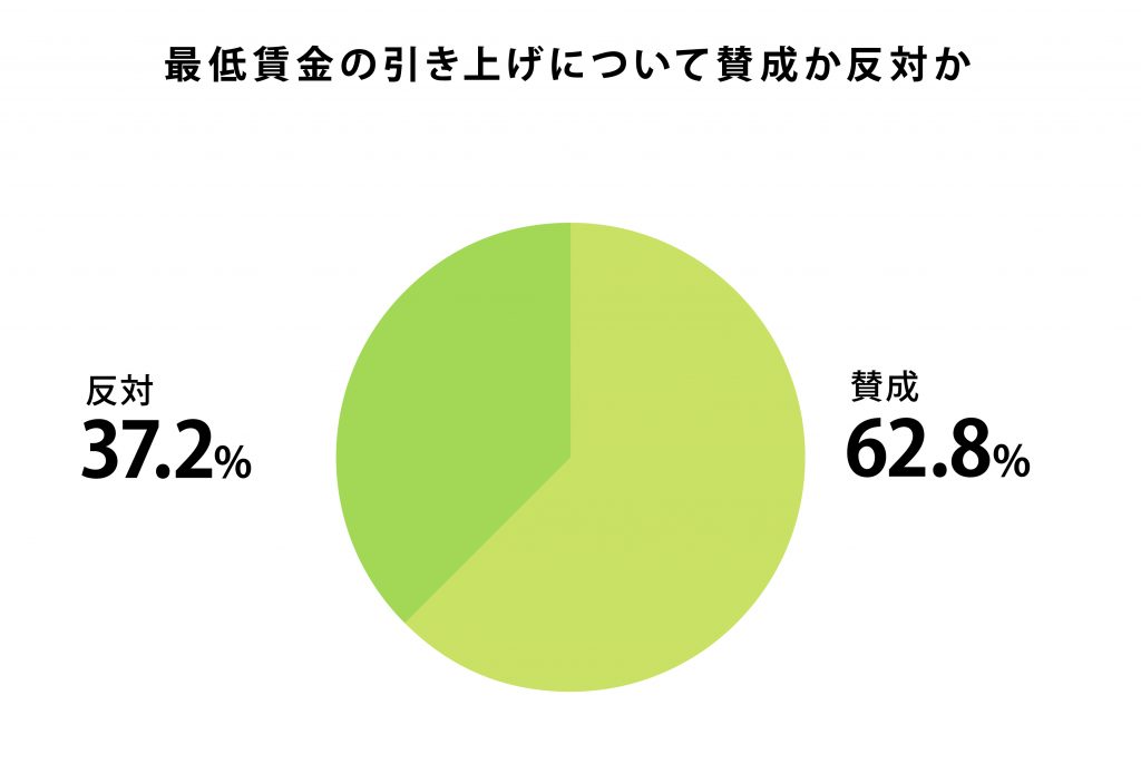 最低賃金の引き上げについて賛成か反対かを尋ねたところ、62.8 %が「賛成」、37.2 %が「反対」という結果になりました。