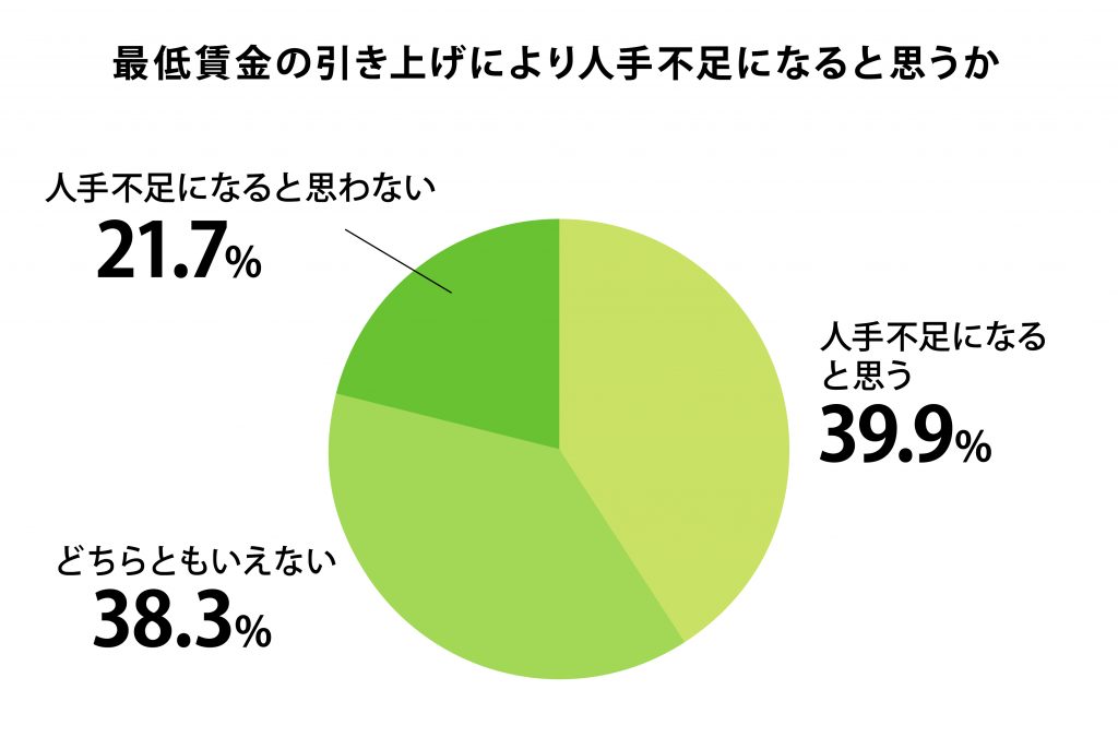 最低賃金の引き上げにより人手不足になると思うかを尋ねたところ、約4割が「人手不足になると思う」と回答しました。「人手不足になるとは思わない」は21.7%、「どちらともいえない」は38.3%という結果になりました。