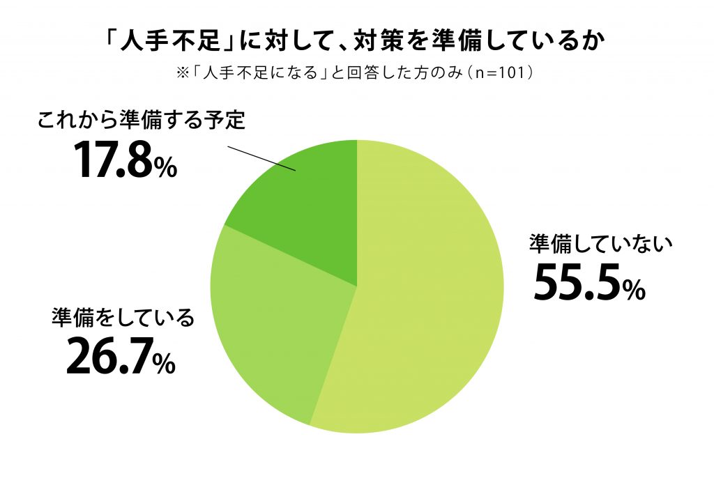 人手不足になると思うかを尋ね、「人手不足になる」と回答した方を対象に、対策を準備しているかを尋ねたところ「準備をしている」(26.7%)と「これから準備する予定」(17.8%)を合算すると44.5%が人手不足に備えようとしていることがわかります。