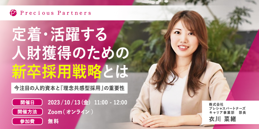採用コンサルティング事業を行う株式会社プレシャスパートナーズ(本社:東京都新宿区、代表取締役社長 CEO:髙﨑 誠司)は、2023年10月13日(金)に無料セミナー「定着・活躍する人財獲得のための新卒採用戦略とは~今注目の人的資本と『理念共感型採用』の重要性~」をオンラインにて開催いたします。