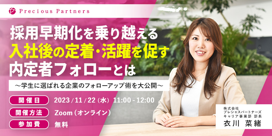 採用コンサルティング事業を行う株式会社プレシャスパートナーズ(本社:東京都新宿区、代表取締役社長 CEO:髙﨑 誠司)は、2023年11月22日(水)に無料セミナー「採用早期化を乗り越える|入社後の定着・活躍を促す内定者フォローとは 〜学生に選ばれる企業のフォローアップ術を大公開〜」をオンラインにて開催いたします。