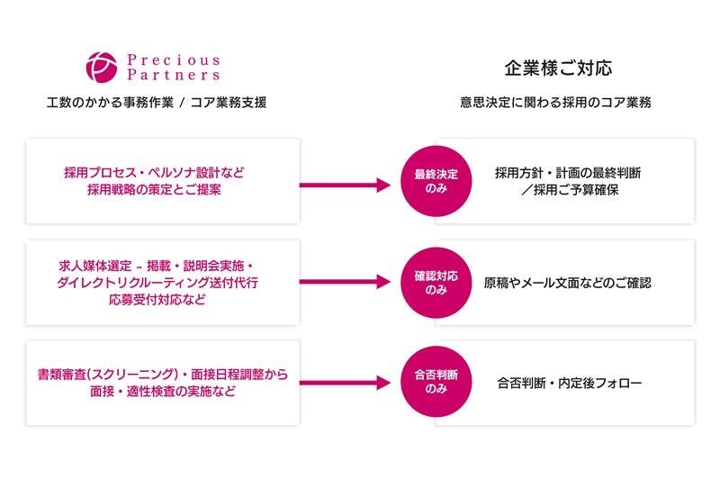 プレシャスパートナーズが開始する人事コンサルティングサービスは、働く条件だけではなく、“企業理念”や“カルチャー”“ビジョン”などの企業の根本となる部分に共感を⽣み出すことに重きを置き、採用後の人財が定着・活躍できるようサポートすることで、労働市場に貢献してまいります。