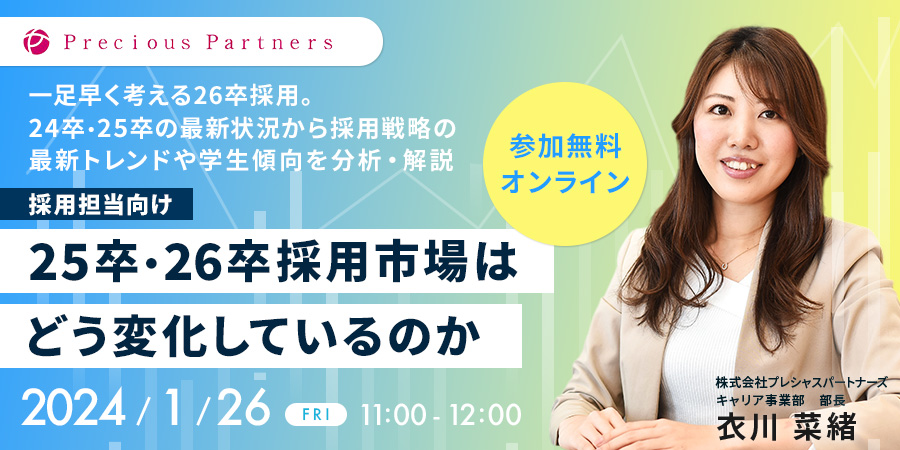 採用コンサルティング事業を行う株式会社プレシャスパートナーズ(本社:東京都新宿区、代表取締役社長 CEO:髙﨑 誠司、以下:プレシャスパートナーズ)は、2024年1月26日(金)に無料セミナー「【採用担当向け】25卒・26卒採用市場はどう変化しているのか|一足先に考える26卒採用戦略」をオンラインにて開催いたします。