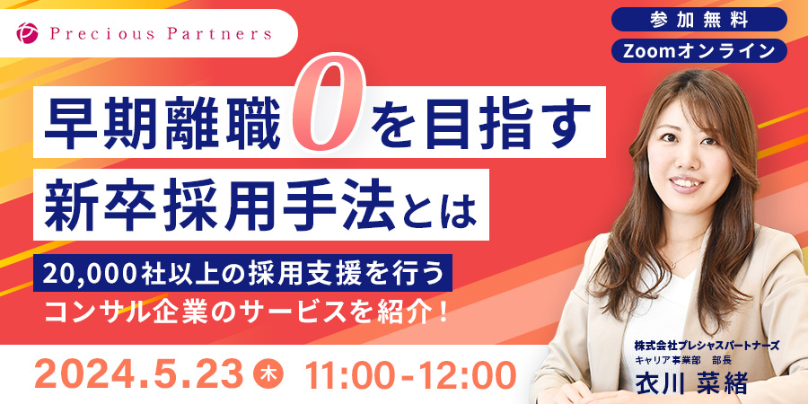採用コンサルティング事業を行う株式会社プレシャスパートナーズ(本社:東京都新宿区、代表取締役社長 CEO:髙﨑 誠司、以下:プレシャスパートナーズ)は、2024年5月23日(木)に無料ウェビナー「採用のミスマッチを防ぎ、早期離職0を目指す新卒採用手法セミナー」をオンラインにて開催いたします。