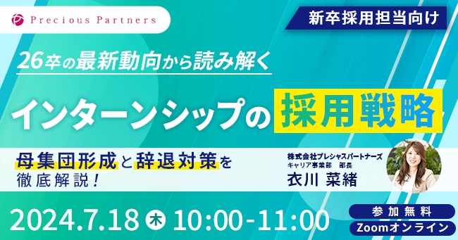 採用コンサルティング事業を行う株式会社プレシャスパートナーズ(本社:東京都新宿区、代表取締役社長 CEO:高崎 誠司、以下:プレシャスパートナーズ)は、2024年7月18日(木)に無料セミナー「26卒の最新動向から読み解くインターンシップの採用戦略」をオンラインにて開催いたします。