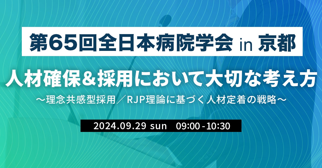 年に1回、学術の研修の場として全日病学会を開催しており、65回目となる今年は京都で開催されます。『地域医療構想前夜~ 嵐の中の航海 羅針盤を求めて~』をテーマに開催され、「学会企画5 今後の働き方を考える」のプログラムにて髙﨑が登壇いたします。「人材確保&採用において大切な考え方~理念共感型採用/RJP理論に基づく人材定着の戦略~」についてお話しますので、ぜひご参加ください。