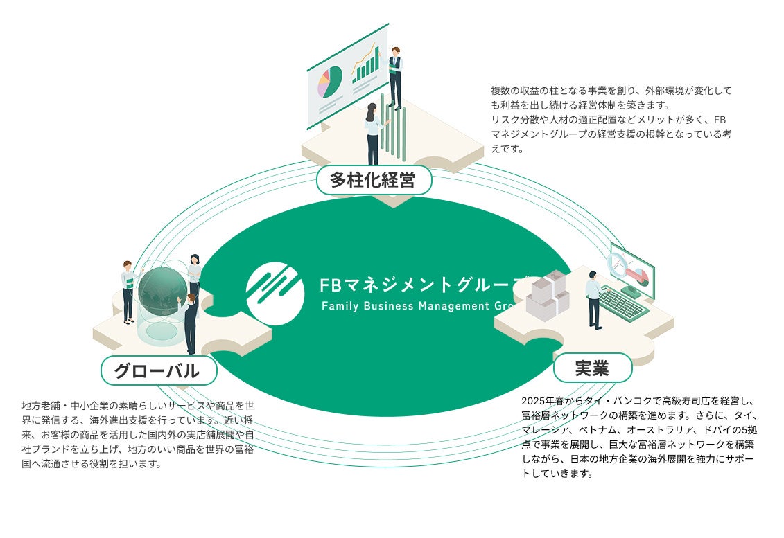 FBマネジメントグループの強みは、時流をとらえた新しいビジネスモデルに、国内外の上質なネットワークとコラボ力を掛け合わせ、唯一無二の価値を創造することです。 さらに実業では、2025年、海外富裕層ネットワーク構築のため、バンコクの高級寿司店の経営権取得を決定し、地方企業が海外へと進出するための足掛かりを構築しています。