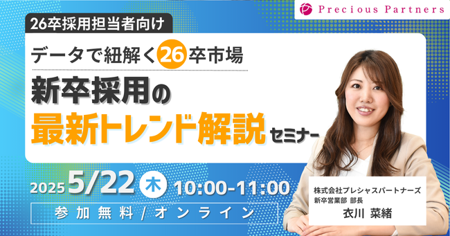 採用コンサルティング事業を行う株式会社プレシャスパートナーズ(本社:東京都新宿区、代表取締役社長 CEO:高崎 誠司)は、2025年5月22日(木)に『【採用担当向け】データで紐解く26卒市場|新卒採用の最新トレンド解説セミナー』をオンラインにて開催いたします。