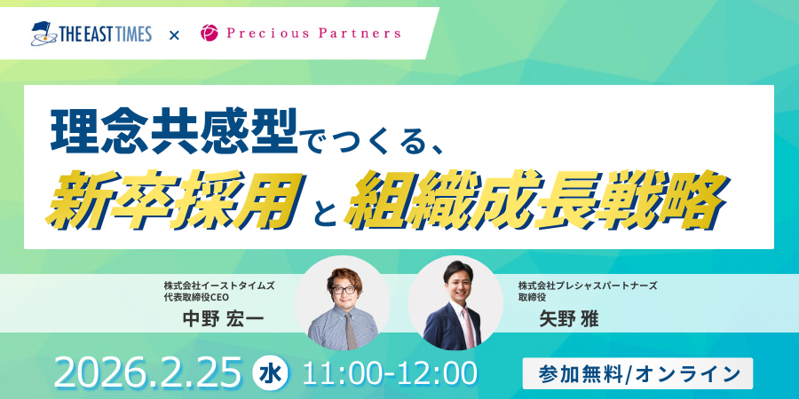 採用コンサルティング事業を行う株式会社プレシャスパートナーズ(本社:東京都新宿区、代表取締役社長 CEO:髙﨑 誠司)は、株式会社イーストタイムズ(本社:東京都港区、代表取締役:中野 宏一)と共同で2026年2月25日(水)にオンラインセミナー『理念共感型でつくる、新卒採用と組織成長戦略』を開催いたします。