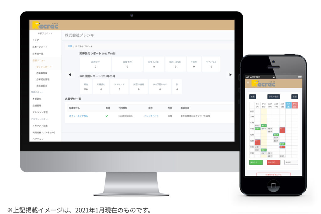 管理画面は、「応募受付」「面接予約」「採用(入社)」「採用(辞退)」「不採用」「キャンセル」などの応募受付レポートや、SMS送信レポートがひと目でわかる、シンプルな仕様となっています。