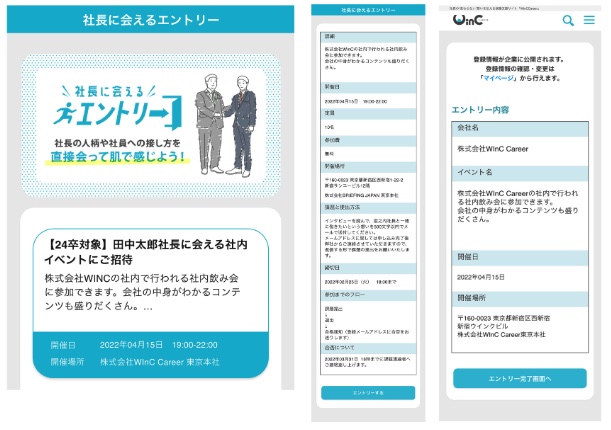「社長に会えるエントリー」は、学生から企業へアプローチができる機能です。