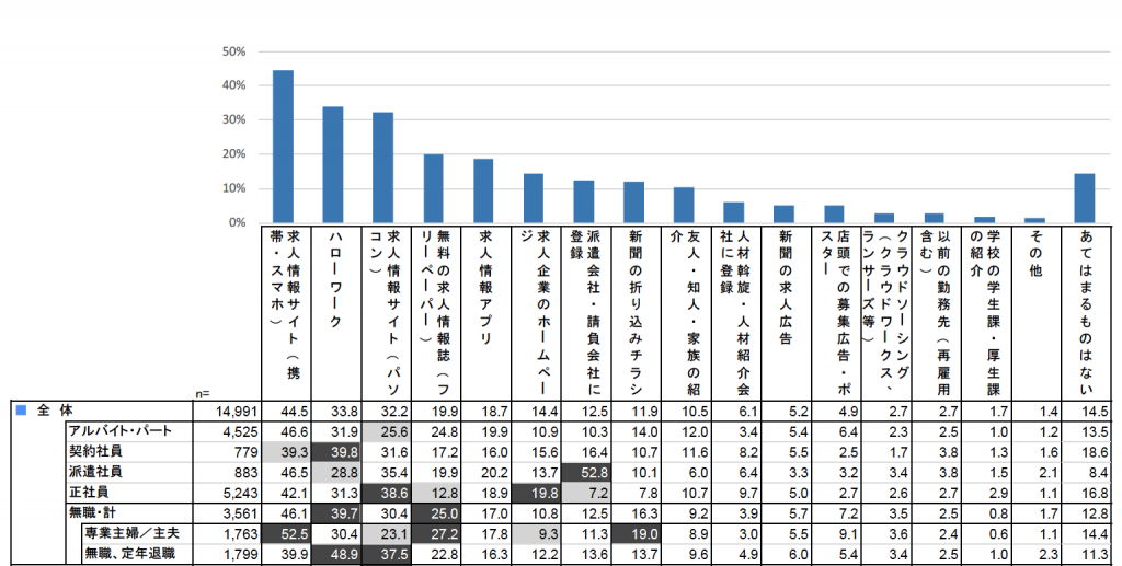 上記調査より、求人媒体のなかでも「Web媒体(求人情報サイト)」や「紙媒体(求人情報誌や折込チラシなど)」は、求職者に最も利用されている求人情報源といえます。