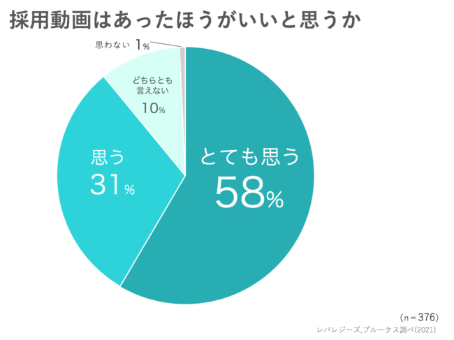 レバレジーズ株式会社が行った、コロナ禍での就職活動における採用動画視聴に関する調査によると、「採用動画があった方がいいと思うか」という質問に対して、「とても思う」が58%、「思う」が31%という回答が得られました。(※1)