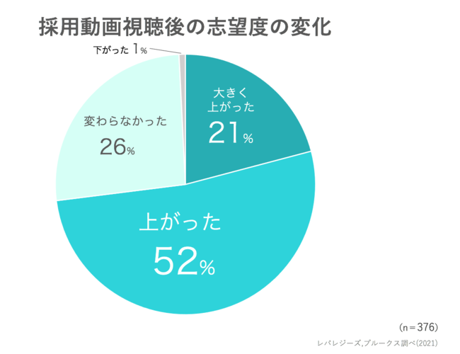 さらに、採用動画視聴後の志望度の変化を問う質問には、「志望度が上がった」が52%、「志望度が大きく上がった」が21%となり、合わせて7割以上の学生が、採用動画を視聴することにより志望度が上昇していることがわかっています。(※2)