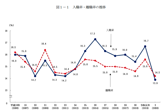 厚生労働省の統計「令和2年雇用動向調査」(※1)によると、日本の常用労働者における平均離職率は14.2%となっています。