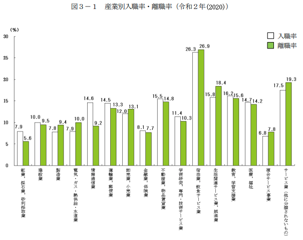 また、同じく「令和2年雇用動向調査」の産業別離職率のデータによると、上から順に「宿泊業・飲食サービス業」が26.9%、「サービス業」が19.3%、「生活関連サービス業、娯楽業」が18.4%と、サービス系の業種の離職率が高くなっています。(※2)